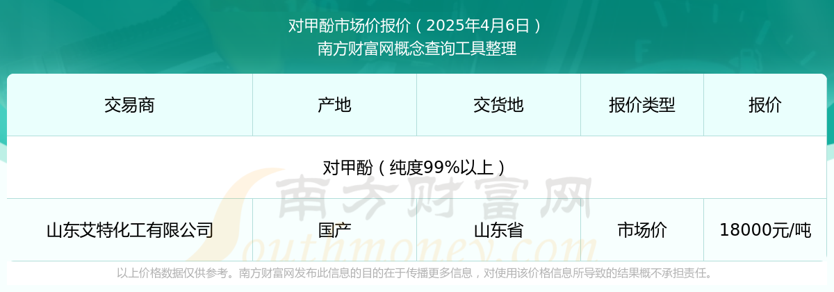 2025年4月6日,对甲酚(纯度99%以上)市场价价格为18000.00元/吨,报价人:山东艾特化工有限公司,交易地点为山东省。