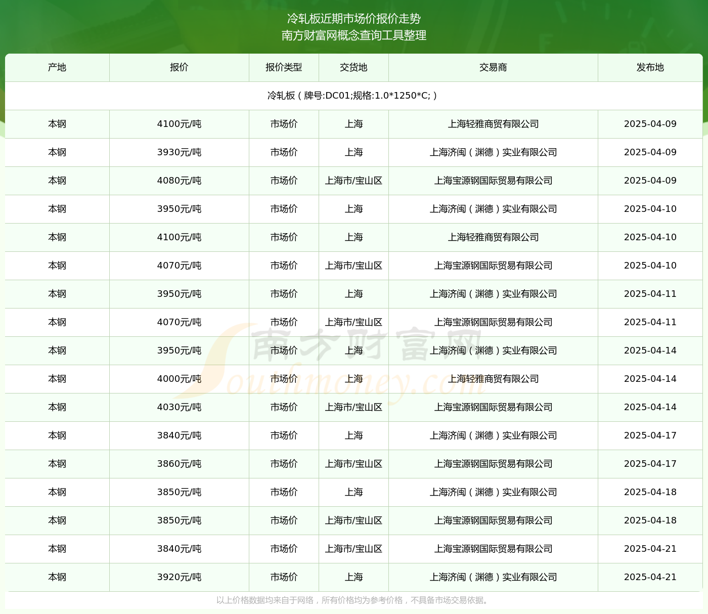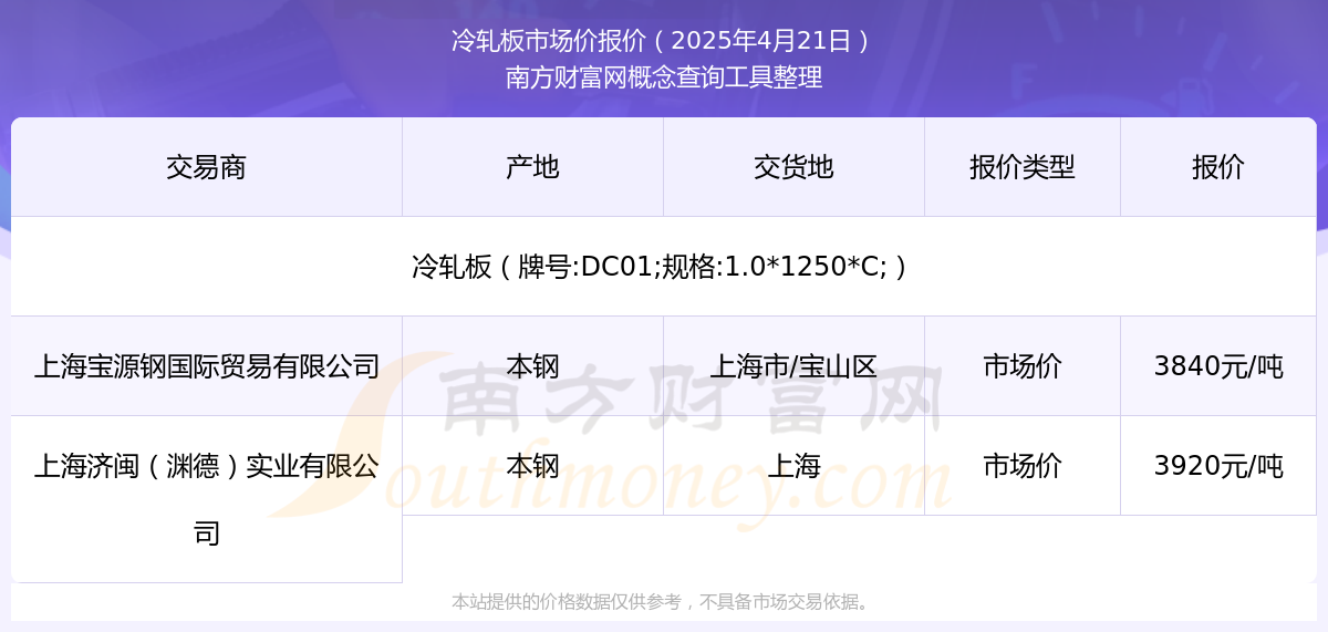 2025年4月21日,上海济闽(渊德)实业有限公司冷轧板(牌号:DC01;规格:1.0*1250*C;),本钢,交易地点为上海,市场价报价为3920.00元/吨。
