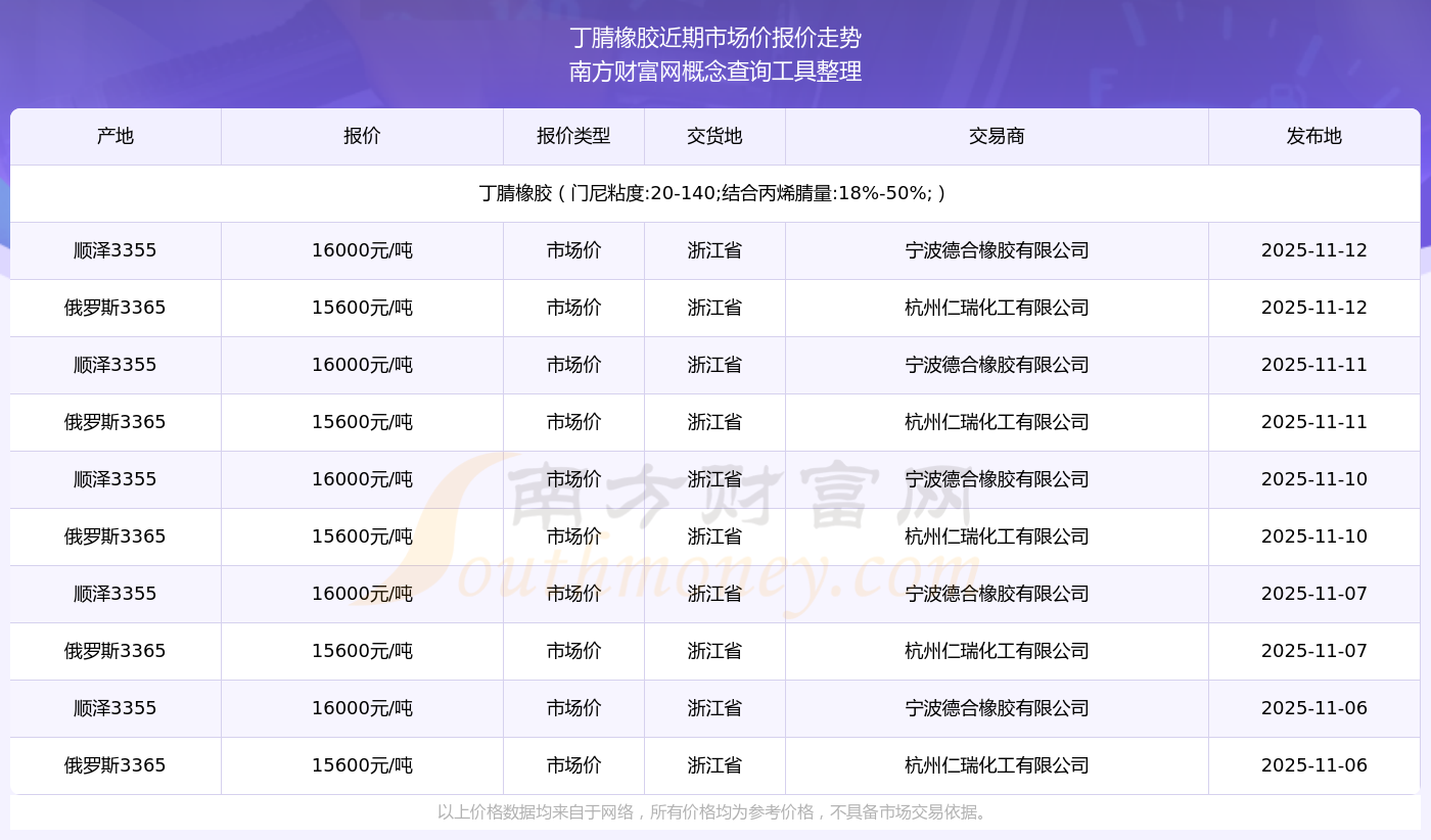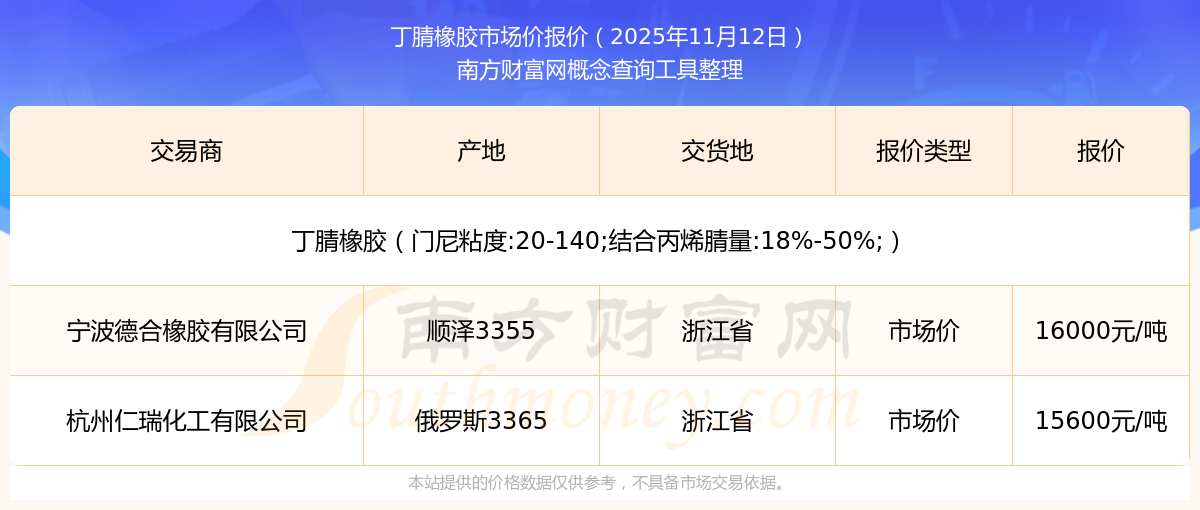 2025年11月12日,宁波德合橡胶有限公司丁腈橡胶(门尼粘度:20-140;结合丙烯腈量:18%-50%;),顺泽3355,交易地点为浙江省,市场价报价为16000.00元/吨。