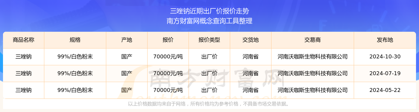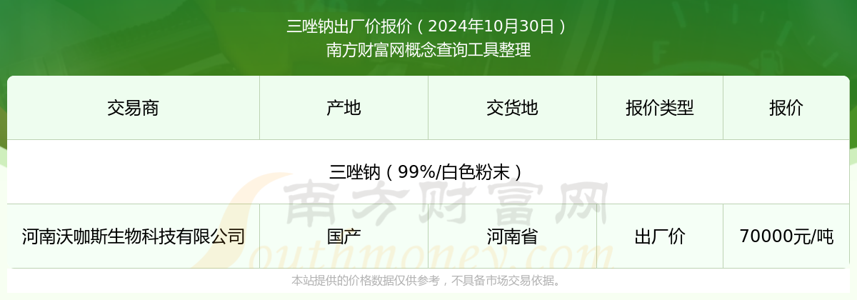 2024年10月30日,河南沃咖斯生物科技有限公司三唑钠(99%/白色粉末),国产,交易地点为河南省,出厂价报价为70000.00元/吨。