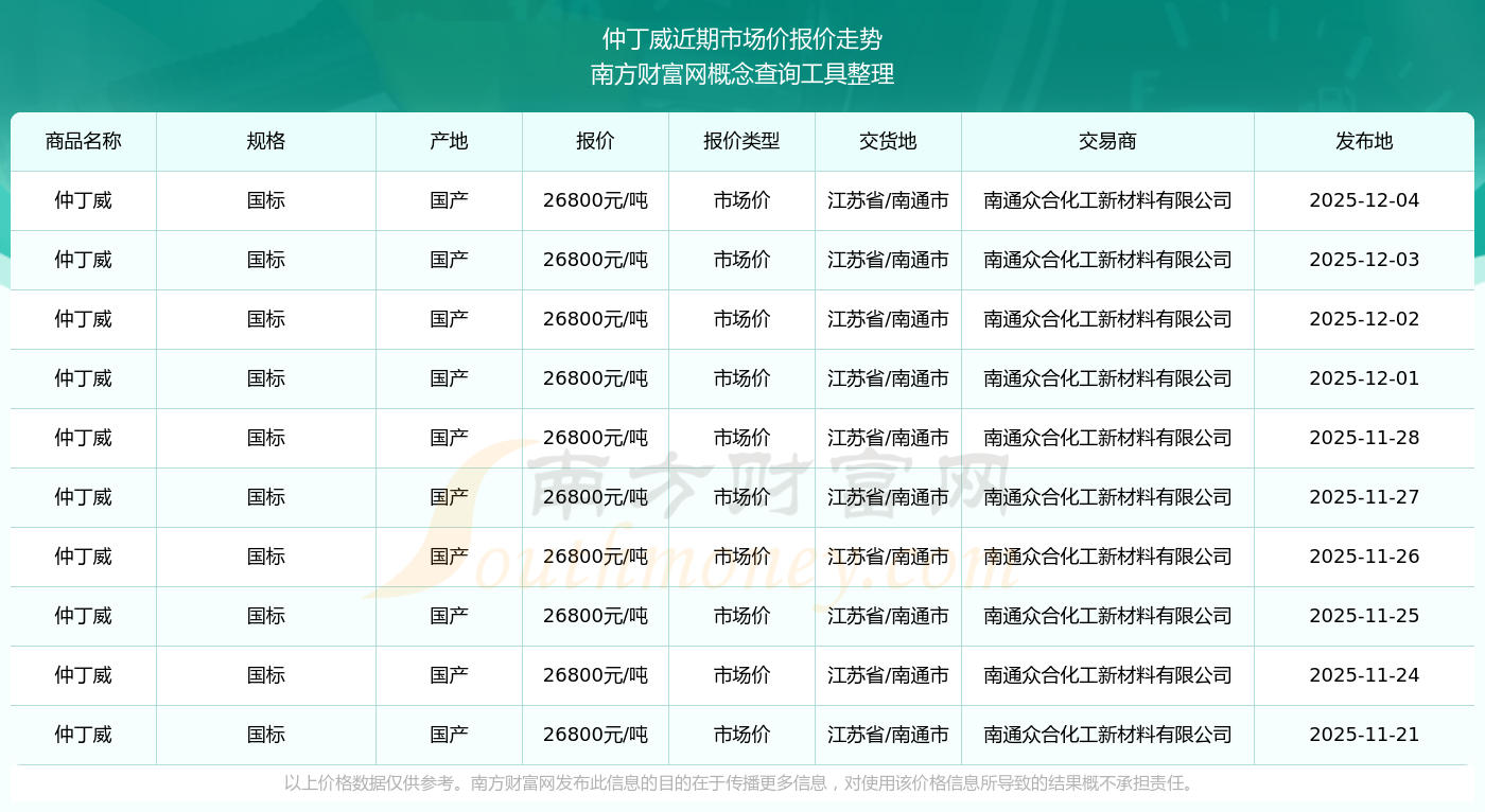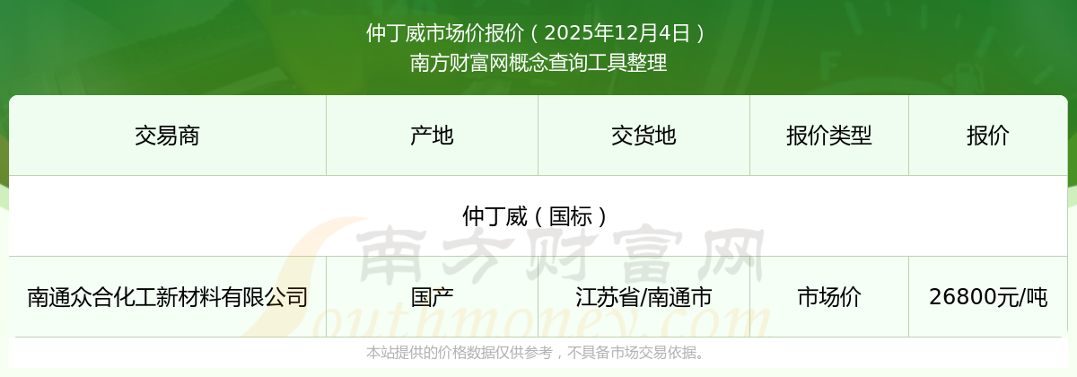 2025年12月4日,仲丁威(国标)市场价价格为26800.00元/吨,报价人:南通众合化工新材料有限公司,交易地点为江苏省/南通市。