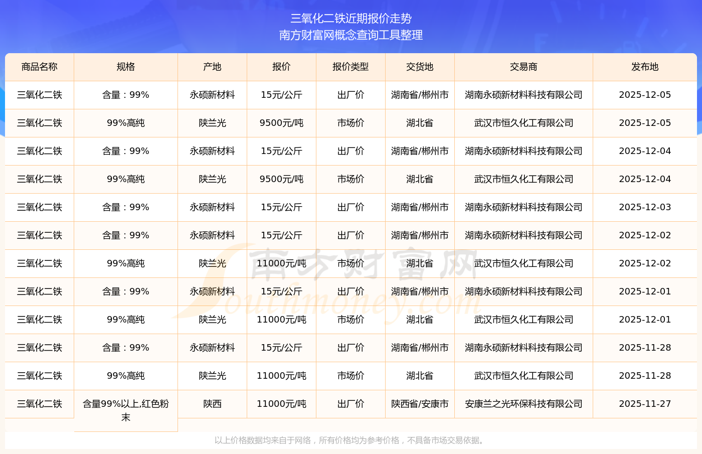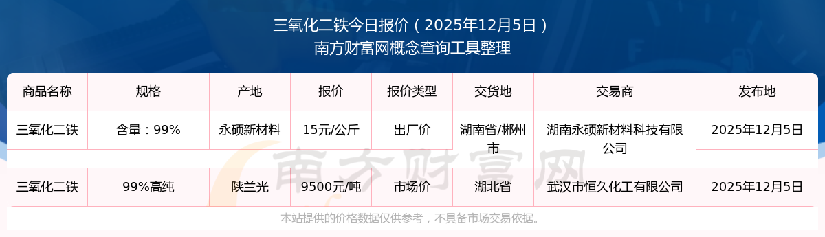 2025年12月5日,湖南永硕新材料科技有限公司三氧化二铁(含量:99%),永硕新材料,交易地点为湖南省/郴州市,报价为15.00元/公斤。