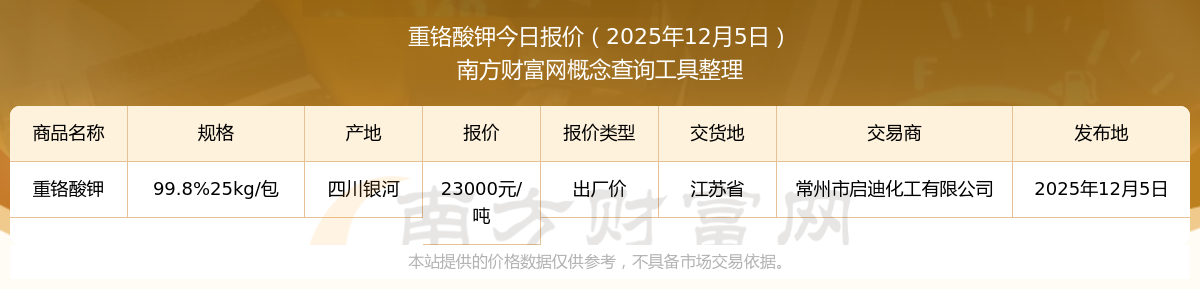 2025年12月5日,重铬酸钾(99.8%25kg/包)出厂价价格为23000.00元/吨,报价人:常州市启迪化工有限公司,交易地点为江苏省。
