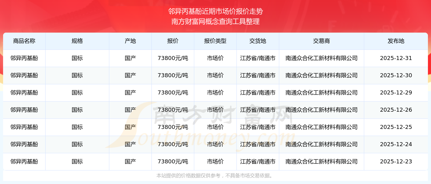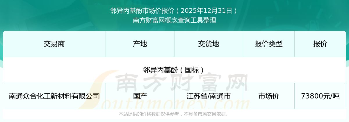 2025年12月31日,邻异丙基酚(国标)市场价价格为73800.00元/吨,报价人:南通众合化工新材料有限公司,交易地点为江苏省/南通市。