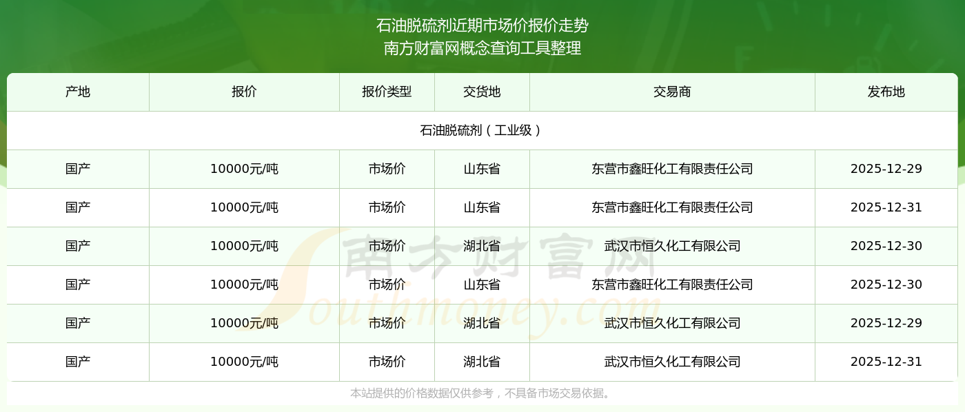 2025年12月31日,东营市鑫旺化工有限责任公司石油脱硫剂(工业级),国产,交易地点为山东省,市场价报价为10000.00元/吨。