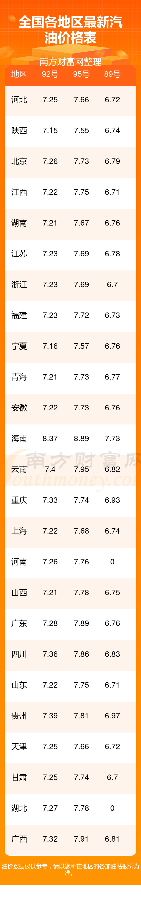 油价数据仅供参考,请以您所在地区的加油站报价为准。南方财富网发布此信息的目的在于传播更多信息,对使用该油价信息所导致的结果概不承担任何责任。