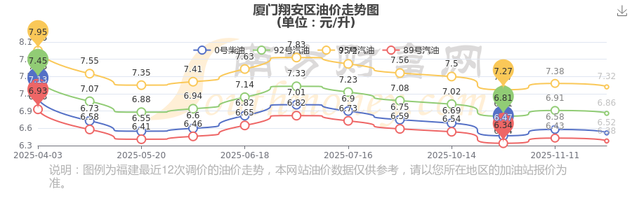 12月7日厦门翔安区汽油、柴油价格是多少钱一升?11月25日油价调整后,每升油价为:92号汽油为6.86元,减了0.05元,减幅达0.72%;95号汽油为7.32元,减了0.06元,减幅达0.81%;89号汽油为6.38元,减了0.05元,减幅达0.78%;0号柴油为6.52元,减了0.06元,减幅达0.91%。