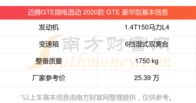 迈腾GTE插电混动 2020款 GTE 豪华型搭载了一台1.4T150马力L4涡轮增压发动机,采用6挡湿式双离合自动档变速箱,常规整备质量1750kg,厂家参考价25.39万元。