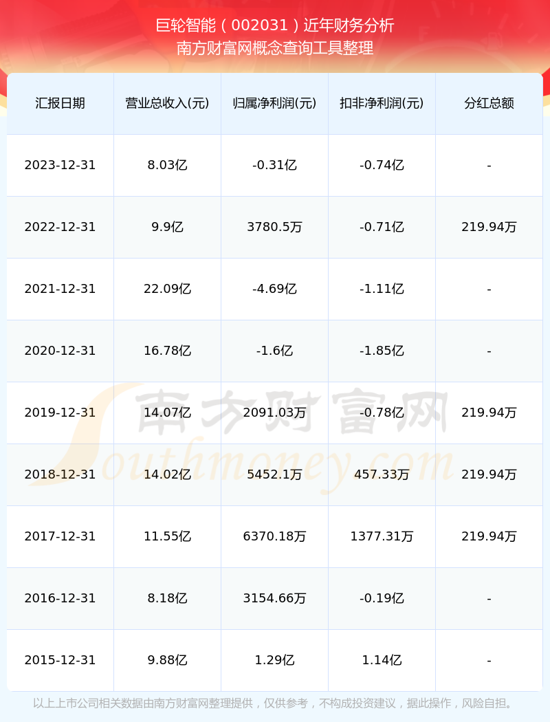 近年巨轮智能分红派息情况如下表所示: