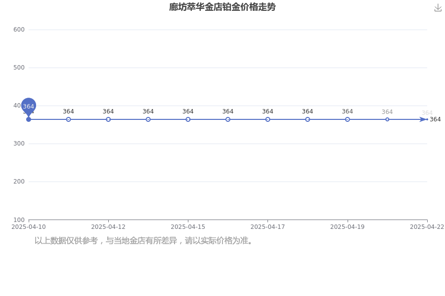 今日(2025年4月22日)廊坊萃华金店铂金价格为364.0元/克。
