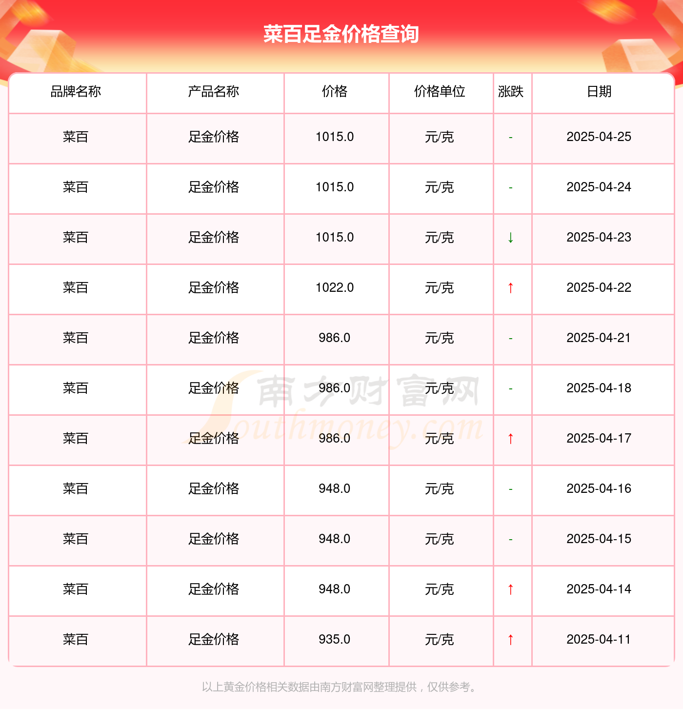 今日(2025年4月26日)菜百足金价格为1015.0元/克。