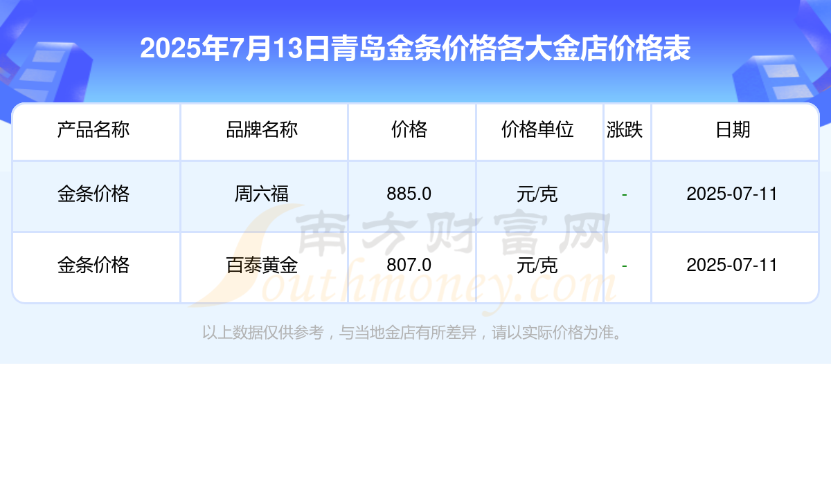2025年7月13日青岛各大金店金条价格最新价格:菜百978.0元/克,菜百8.3元/克,老庙999.0元/克,老庙470.0元/克,老庙955.0元/克,老庙999.0元/克,金至尊998.0元/克,金至尊551.0元/克,金至尊998.0元/克,周生生1004.0元/克,周生生551.0元/克。