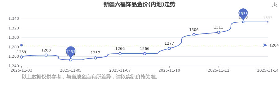 1333.0元/克,此乃新疆六福于 2025年11月15日饰品金价(内地)的挂牌价格。
