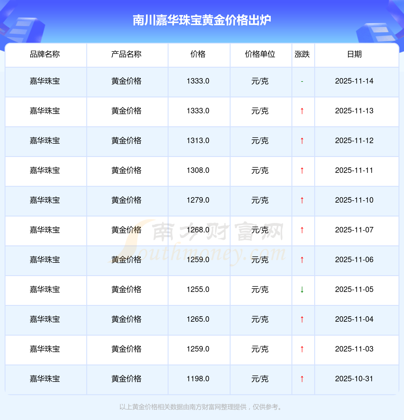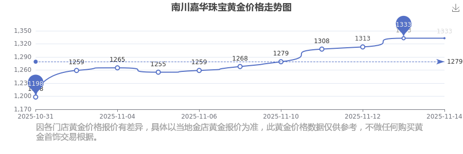 今日(2025年11月15日)南川嘉华珠宝黄金价格最新价格为1333.0元/克。