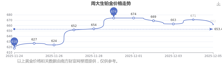 今日(2025年12月7日)周大生铂金价格的价格为662.0元/克。