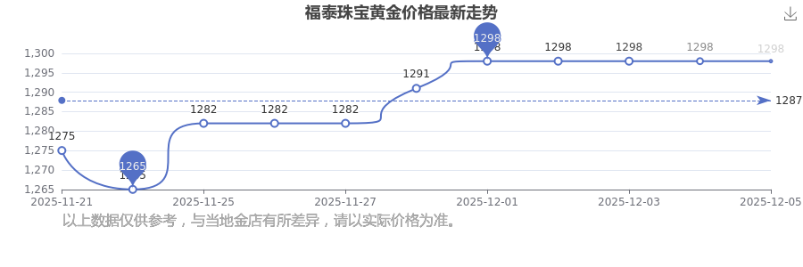 今日黄金价格查询_现在金价黄金一克多少钱,黄金价格是多少钱一克?黄金每克的价格大概是多少范围?今日福泰珠宝黄金价格最新查询:1298.0元/克。
