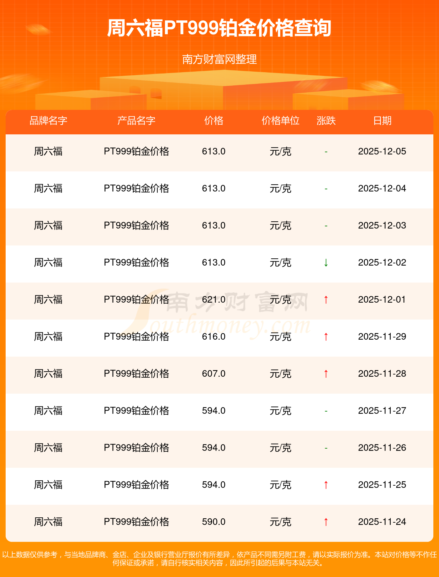 2025年12月7日周六福PT999铂金价格最新是613.0元/克。