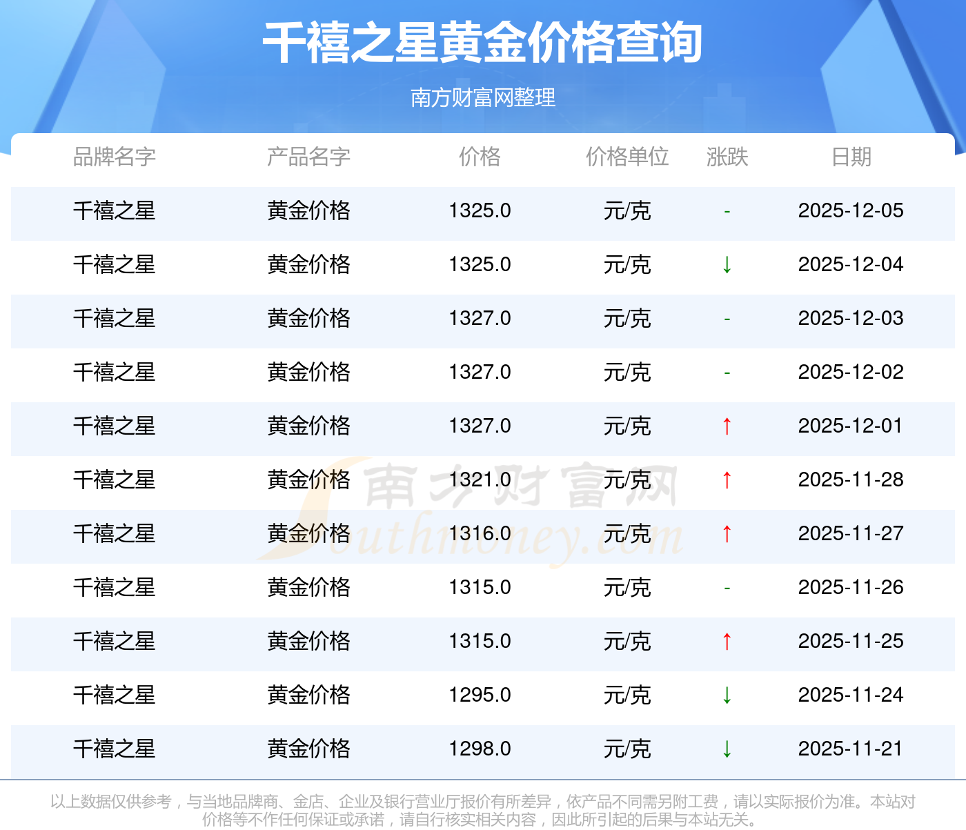 当下,千禧之星 黄金价格今日的最新价格是1325.0元/克。
