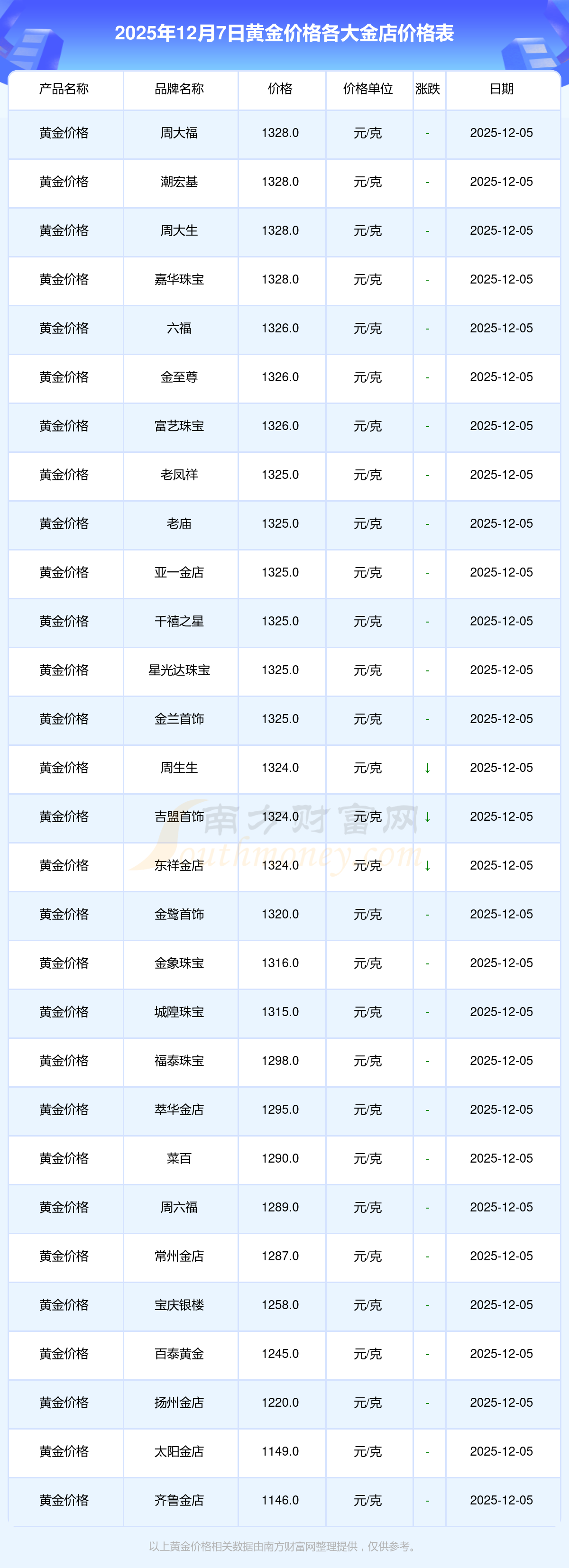 2025年12月7日周大福、周大福、周大福、周大福、周大福、周大福、周大福、老凤祥、老凤祥、老凤祥、周六福等各大金店品牌黄金价格最新价格如下:周大福黄金价格1328.0元/克,周大福铂金价格662.0元/克,周大福饰品金价(内地)1328.0元/克,周大福黄金饰品(香港)46550.0,周大福铂金价格(香港)18970.0,周大福金条价格(香港)41990.0,周大福金条金价(内地)1165.0元/克,老凤祥黄金价格1325.0元/克,老凤祥铂金价格600.0元/克,老凤祥足金价格1325.0元/克,周六福黄金价格1289.0元/克。