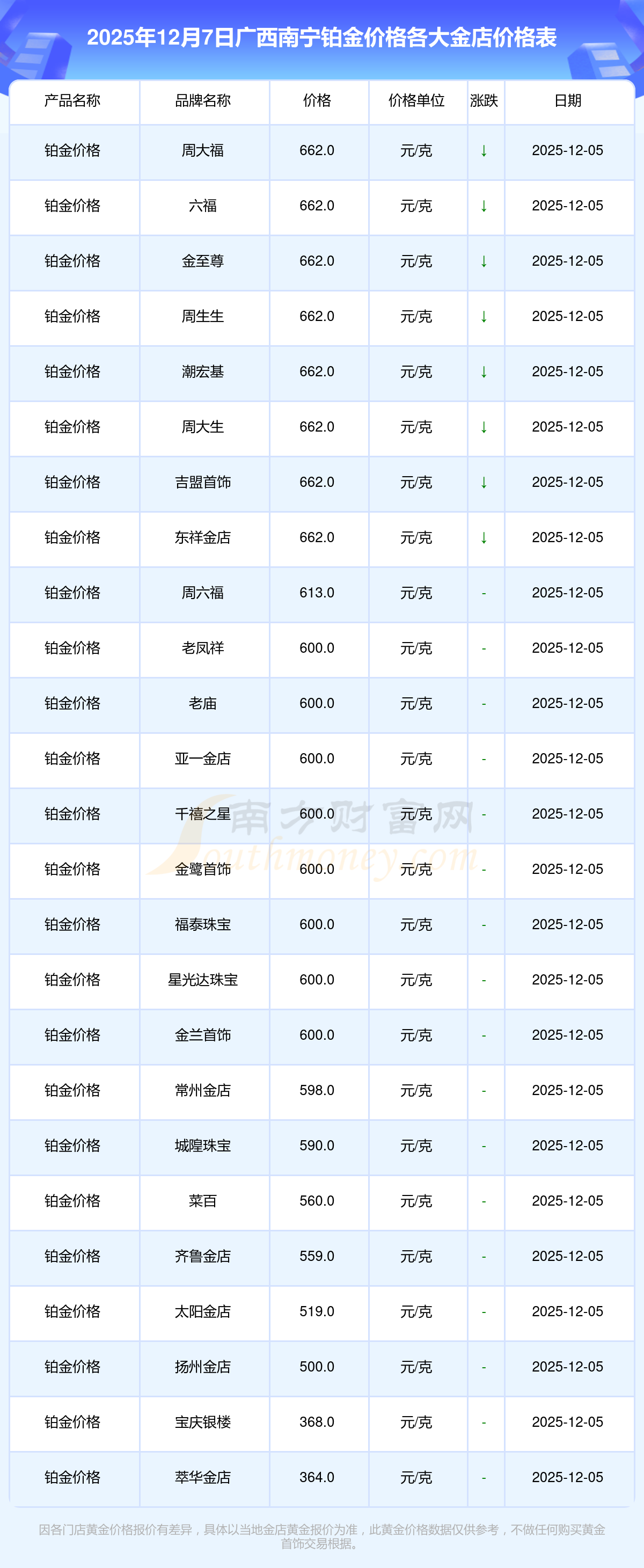 2025年12月7日,广西南宁周大福、周大福、周大福、周大福、周大福、周大福、周大福、老凤祥、老凤祥、老凤祥、周六福等各大金店品牌铂金价格今日价格行情最新来了:周大福1328.0元/克、周大福662.0元/克、周大福1328.0元/克、周大福46550.0、周大福18970.0、周大福41990.0、周大福1165.0元/克、老凤祥1325.0元/克、老凤祥600.0元/克、老凤祥1325.0元/克、周六福1289.0元/克。