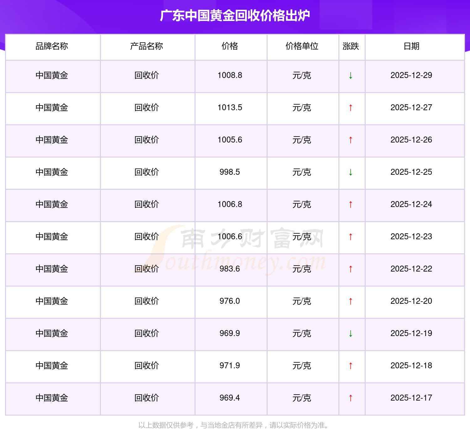 2025年12月29日广东中国黄金回收价格为1008.8元/克。