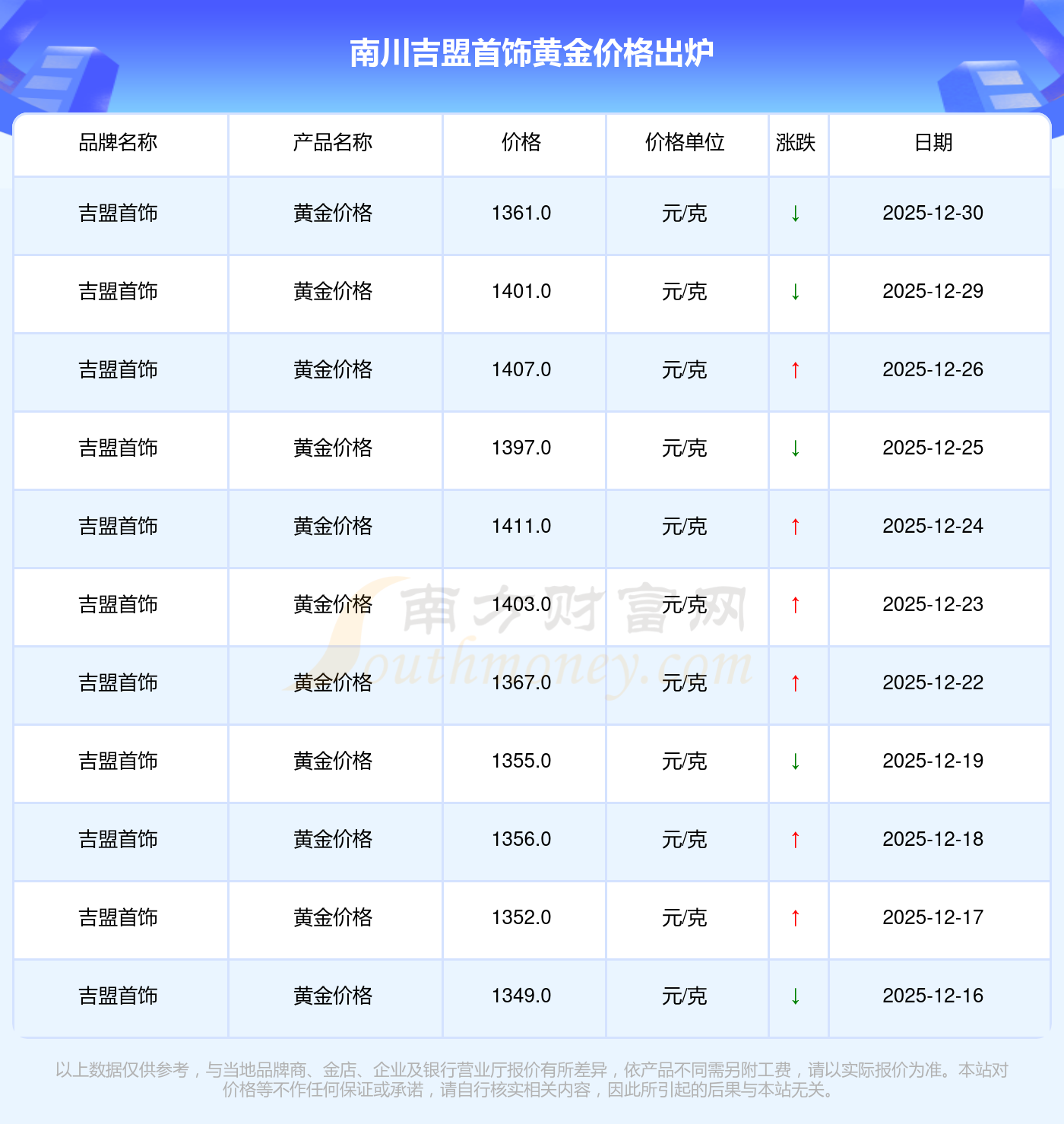 今日黄金价格最低的金店是齐鲁金店,报价1206.0元/克,最高的是萃华金店,报价1413.0元/克。今日黄金价格高低差为207元/克。