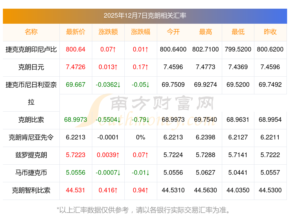 根据今天2025年12月7日汇率计算,CZK兑换CNY汇率最新价0.340200,今开价0.3402,昨收价0.3402,最高价0.3411,最低价0.3397。