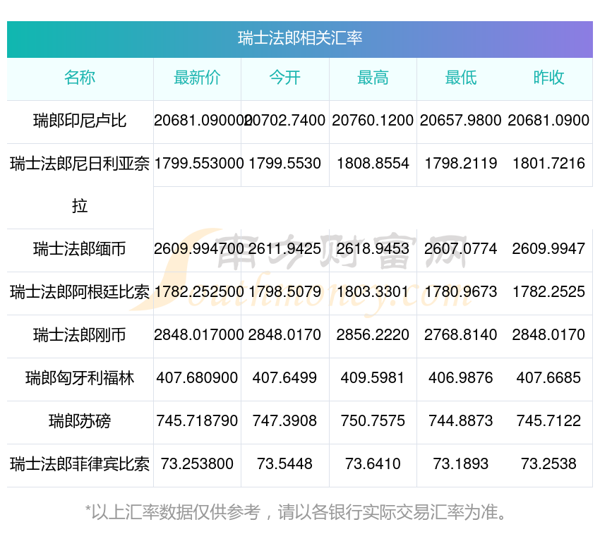 南方财富网为您提供瑞士法郎对南特汇率最新价格详情。