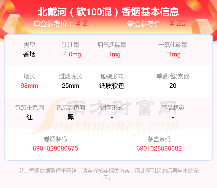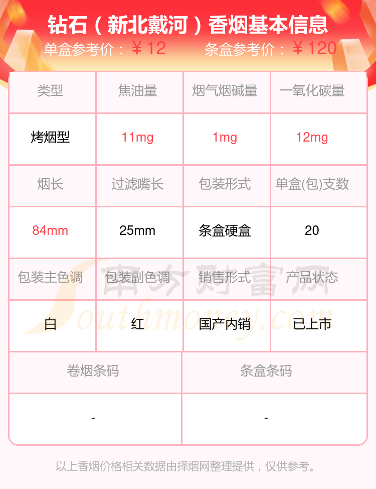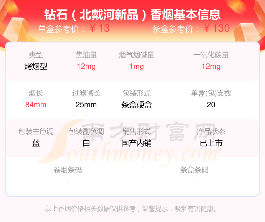 北戴河香烟尼古丁量1-2mg左右的烟有北戴河(软烤)、北戴河(软100混)、北戴河、钻石(北戴河新)、钻石(北戴河新品)、钻石(新北戴河)等,具体价格如下: