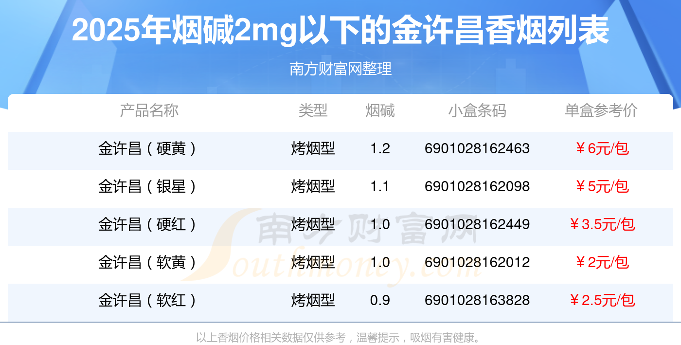 金许昌香烟烟碱2mg以下的烟有金许昌(硬黄)、金许昌(银星)、金许昌(硬红)、金许昌(软黄)、金许昌(软红)等,详细价格如下:
