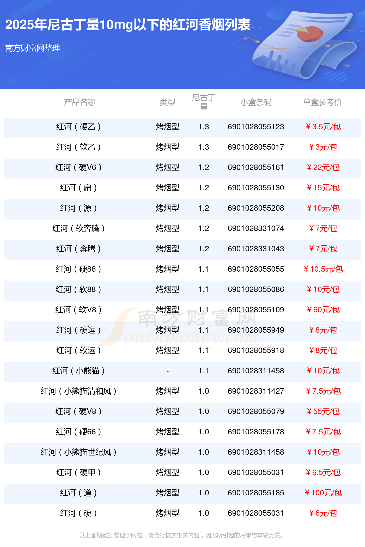 择烟网为大家盘点了红河香烟尼古丁量10mg以下的,分别有红河(硬乙)、红河(软乙)、红河(硬V6)、红河(扁)、红河(源)、红河(软奔腾)、红河(奔腾)、红河(硬88)、红河(软88)、红河(软V8)等,详细价格如下: