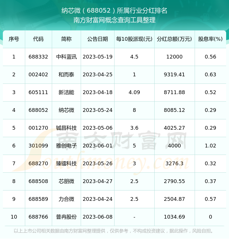 按照南方财富网趋势选股系统统计,纳芯微所属行业为芯片行业,芯片行业分红排名情况如下表: