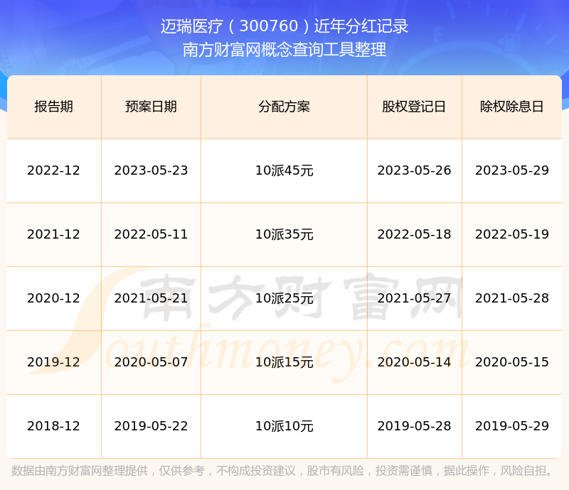 迈瑞医疗最新一次公布的分红方案:10派45元。