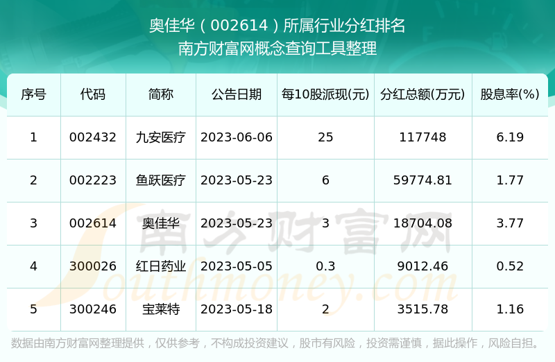 按照南方财富网趋势选股系统统计,奥佳华所属行业为家电行业行业,家电行业行业分红排名情况如下表: