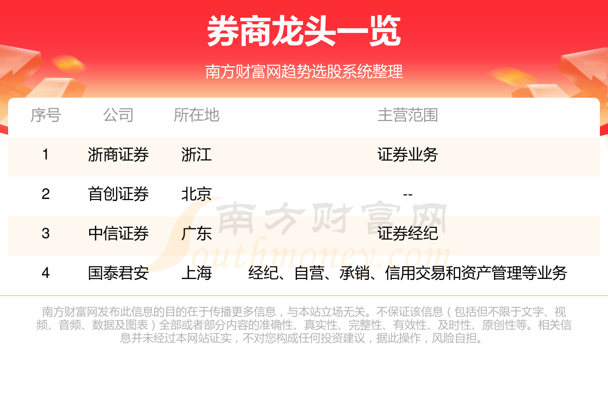 券商概念股有中信证券、东方财富、中信建投、中金公司、中国银河、国泰君安、招商证券、华泰证券、海通证券、申万宏源等67家上市公司。券商龙头股是哪几只?《南方财富网趋势选股系统》为您整理券商龙头股的相关信息。
