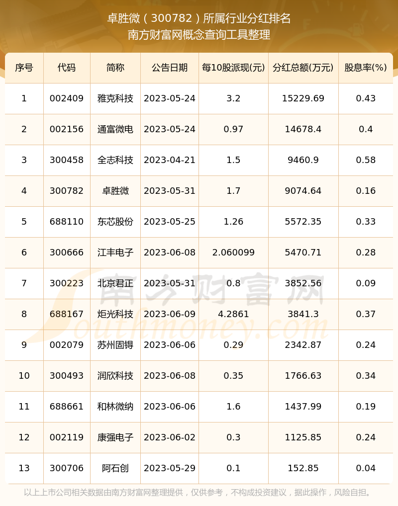 按照南方财富网趋势选股系统统计,卓胜微所属行业为集成电路行业,集成电路行业分红排名情况如下表: