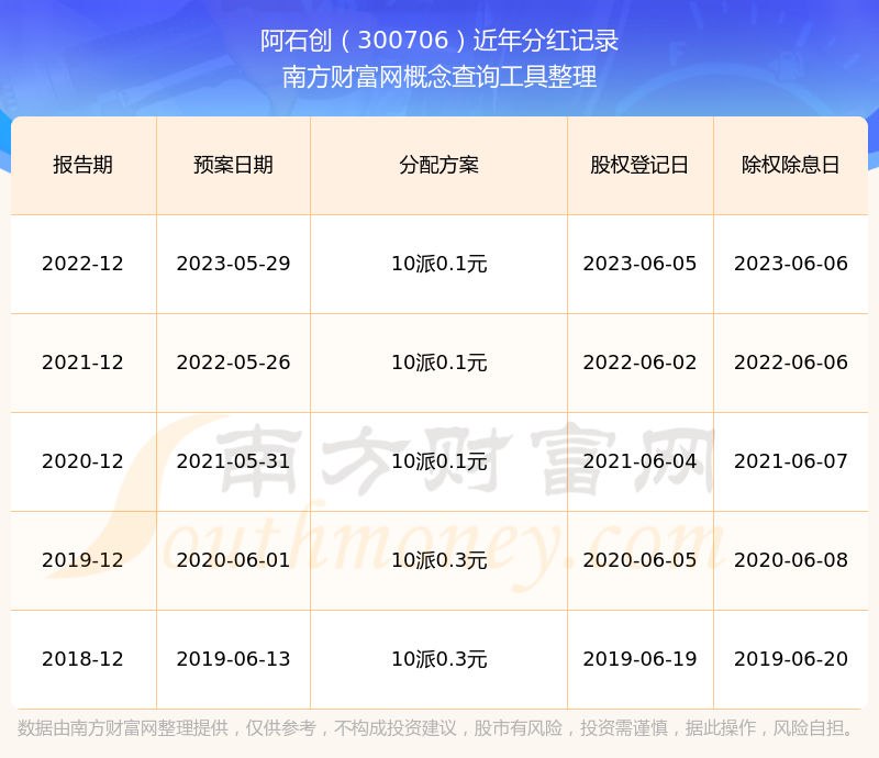 阿石创最新一次公布的分红方案:10派0.1元。