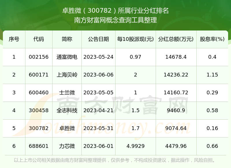 按照南方财富网趋势选股系统统计,卓胜微所属行业为集成电路行业,集成电路行业分红排名情况如下表: