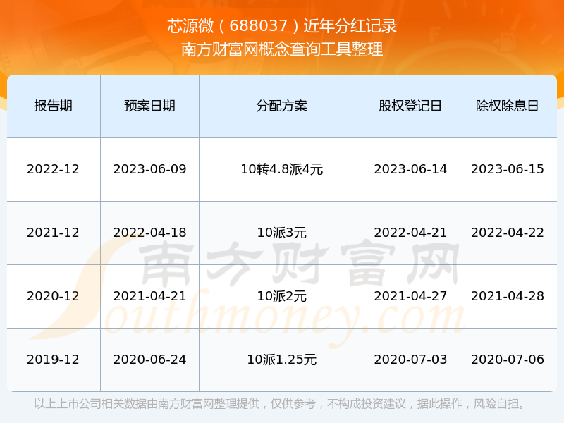 芯源微最新一次公布的分红方案为10转4.8派4元。本次权益分派股权登记日为2023年6月14日,除权除息日为2023年6月15日,派息日为2023年6月15日。