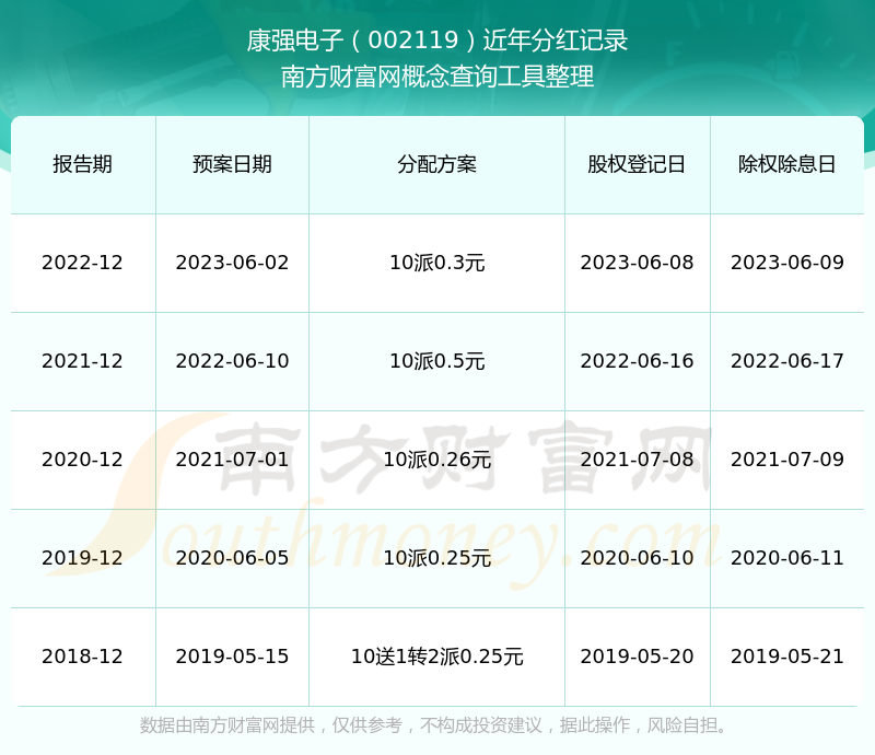 康强电子最新一次公布的分红方案为10派0.3元。本次权益分派股权登记日为2023年6月8日,除权除息日为2023年6月9日,派息日为2023年6月9日。