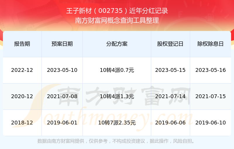 王子新材最新一次公布的分红方案为10转4派0.7元。本次权益分派股权登记日为2023年5月15日,除权除息日为2023年5月16日,派息日为2023年5月16日。