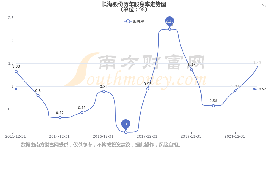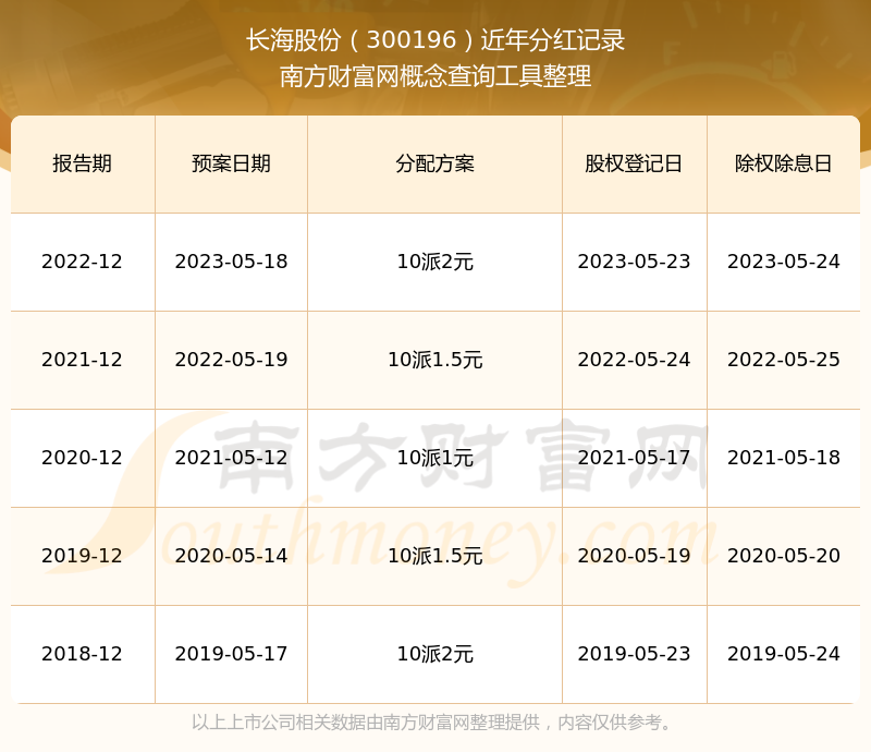 长海股份最新一次公布的分红方案为10派2元。本次权益分派股权登记日为2023年5月23日,除权除息日为2023年5月24日,派息日为2023年5月24日。