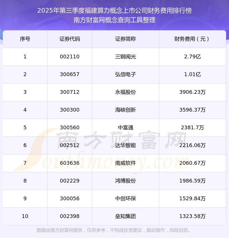 2025年第三季度福建算力概念上市公司财务费用排行榜如下:三钢闽光(002110)的财务费用总额高达2.79亿,弘信电子(300657)和永福股份(300712)分别位居第二和第三,海峡创新(300300)、中富通(300560)、达华智能(002512)、南威软件(603636)、鸿博股份(002229)、中创环保(300056)、垒知集团(002398)分别进入前十,其财务费用总额分别排名第4-10名。