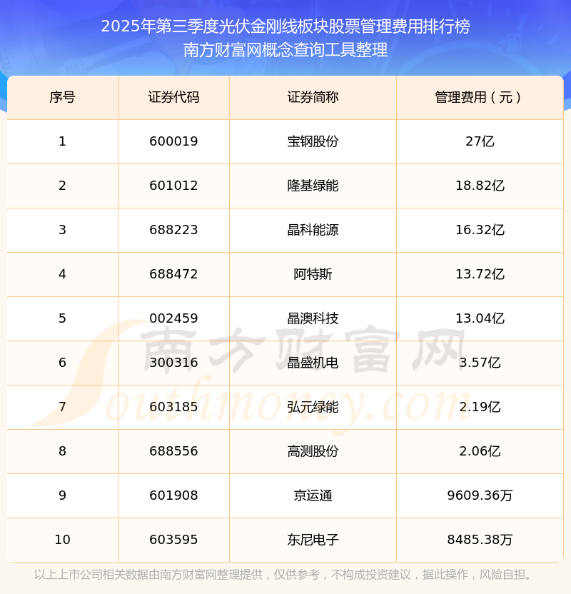 2025年第三季度,光伏金刚线板块股票管理费用排行榜如下:宝钢股份(600019)的管理费用总额高达27亿,隆基绿能(601012)和晶科能源(688223)分别排名第二和第三,阿特斯(688472)、晶澳科技(002459)、晶盛机电(300316)、弘元绿能(603185)、高测股份(688556)、京运通(601908)、东尼电子(603595)分别进入前十,其管理费用总额分别排名第4-10名。