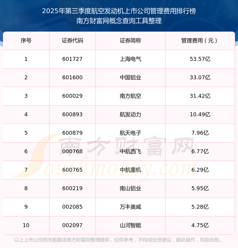 2025年第三季度,航空发动机上市公司管理费用排名中,上海电气(601727)的管理费用总额高达53.57亿,中国铝业(601600)和南方航空(600029)排名第二和第三,航发动力(600893)、航天电子(600879)、中航西飞(000768)、中航重机(600765)、南山铝业(600219)、万丰奥威(002085)、山河智能(002097)进入前十,其管理费用总额分别排名第4-10名。