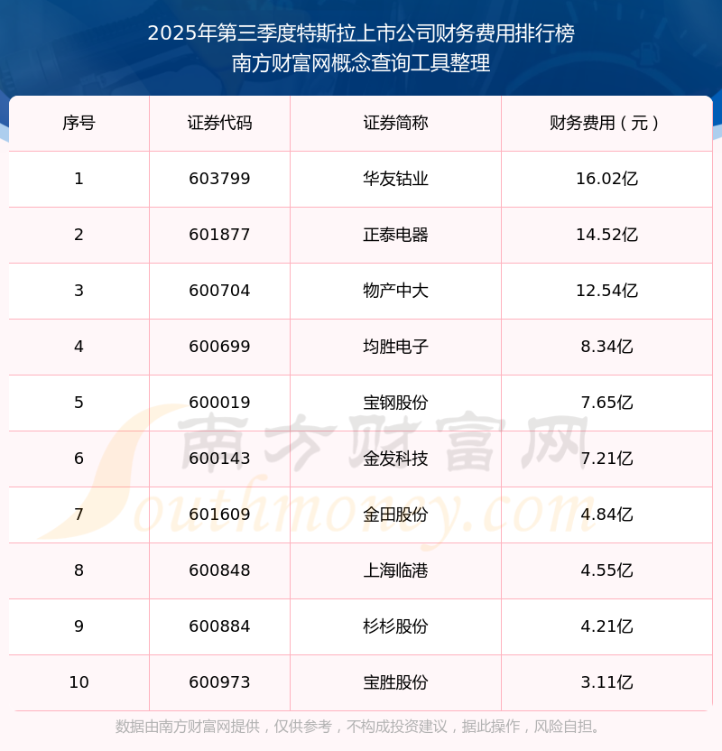 2025年第三季度,特斯拉上市公司财务费用排行榜中,华友钴业(603799)财务费用总额高达16.02亿,正泰电器(601877)和物产中大(600704)位居第二和第三,均胜电子(600699)、宝钢股份(600019)、金发科技(600143)、金田股份(601609)、上海临港(600848)、杉杉股份(600884)、宝胜股份(600973)进入前十,财务费用总额分别排名第4-10名。