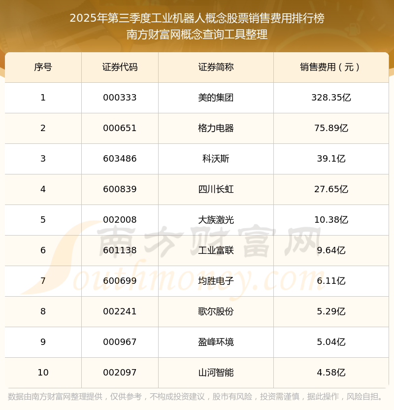 2025年第三季度工业机器人概念股票销售费用排行榜如下:美的集团(000333)的销售费用总额高达328.35亿,格力电器(000651)和科沃斯(603486)分别位居第二和第三,四川长虹(600839)、大族激光(002008)、工业富联(601138)、均胜电子(600699)、歌尔股份(002241)、盈峰环境(000967)、山河智能(002097)分别进入前十,其销售费用总额分别排名第4-10名。