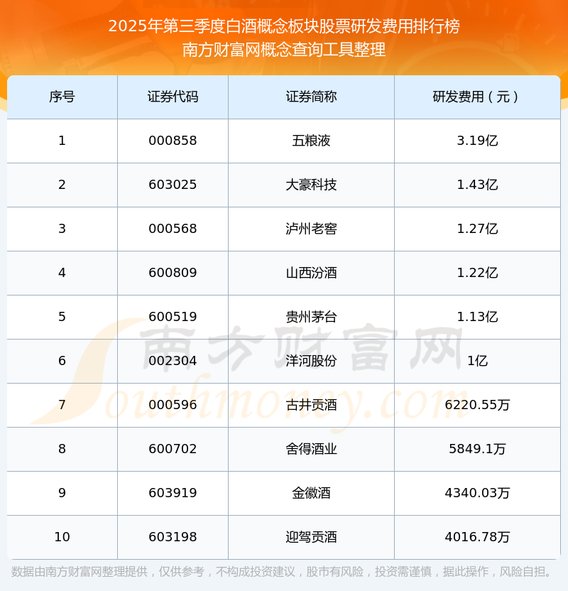 2025年第三季度,白酒概念板块股票研发费用排行榜中,五粮液(000858)研发费用总额高达3.19亿,大豪科技(603025)和泸州老窖(000568)排名第二和第三,山西汾酒(600809)、贵州茅台(600519)、洋河股份(002304)、古井贡酒(000596)、舍得酒业(600702)、金徽酒(603919)、迎驾贡酒(603198)进入前十,研发费用总额分别排名第4-10名。