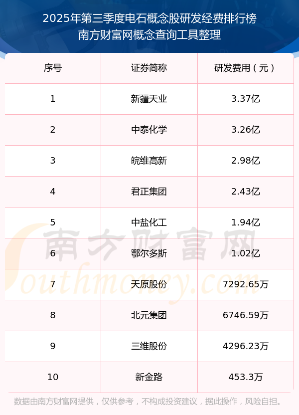 2025年第三季度电石概念股研发经费排行榜如下:新疆天业(600075)研发经费总额高达3.37亿,中泰化学(002092)和皖维高新(600063)分别排名第二和第三,君正集团(601216)、中盐化工(600328)、鄂尔多斯(600295)、天原股份(002386)、北元集团(601568)、三维股份(603033)、新金路(000510)分别进入前十,其研发经费总额分别排名第4-10名。