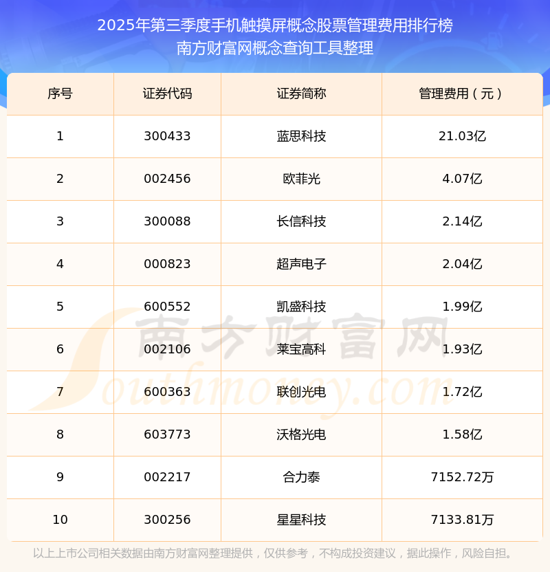2025年第三季度,手机触摸屏概念股票管理费用排名中,蓝思科技(300433)的管理费用总额高达21.03亿,欧菲光(002456)和长信科技(300088)排名第二和第三,超声电子(000823)、凯盛科技(600552)、莱宝高科(002106)、联创光电(600363)、沃格光电(603773)、合力泰(002217)、星星科技(300256)进入前十,其管理费用总额分别排名第4-10名。
